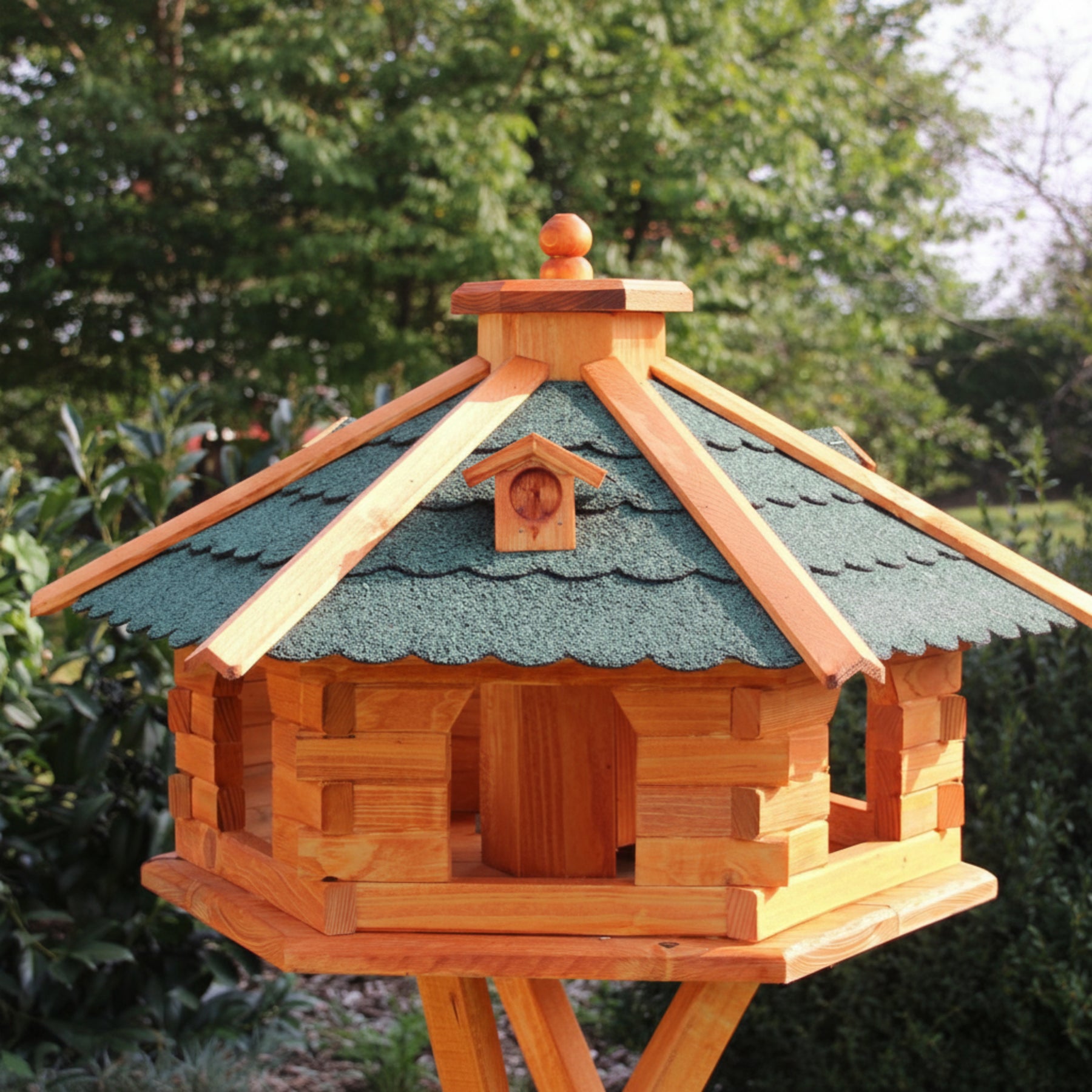 Dieses große XXL Luxus Vogelhaus ist ein hochwertiger Blickfang für jeden Garten. Mit seiner aufwendigen Verarbeitung, dem großzügigen Futterbereich und dem offenen Design bietet es Wildvögeln eine komfortable und gut erreichbare Futterstelle aus allen Richtungen.
